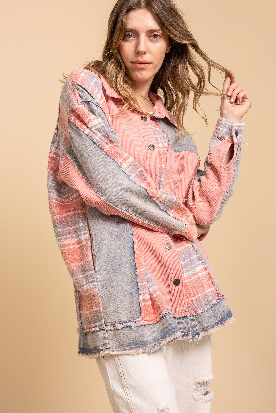 PLAID MIX COLOR BLCOK CORDUROY SHACKET OVERSIZED FIT SIDE POCKETS FRAYED RAW SEAMING GARMENT WASHED